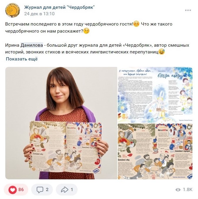 В соцсетях детского журнала «Чердобряк» опубликовано интервью Ирины Даниловой о работе с изданием. Полный текст интервью>>