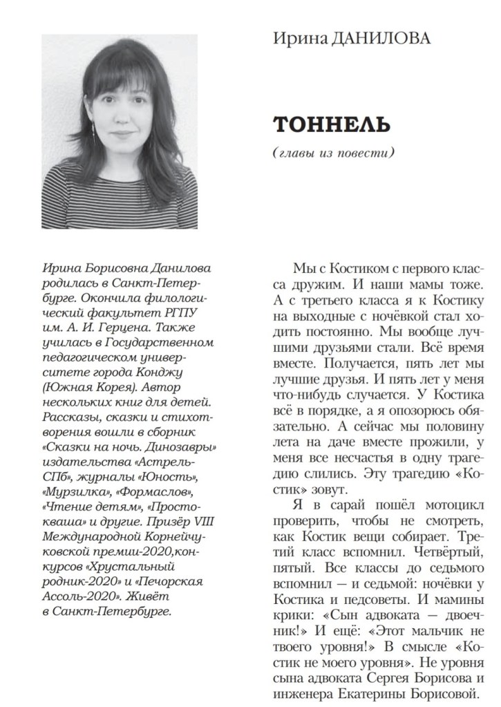 Первые пять глав из моей повести «Тоннель» вышли в новом выпуске литературно-художественного и общественно-политического журнала «Гостиный Дворъ», выпускаемого при поддержке Министерства культуры Оренбургской области и Оренбургского Дома литераторов им. С.Т. Аксакова. Первую часть повести можно прочесть бесплатно в электронной версии журнала по этой ссылке.