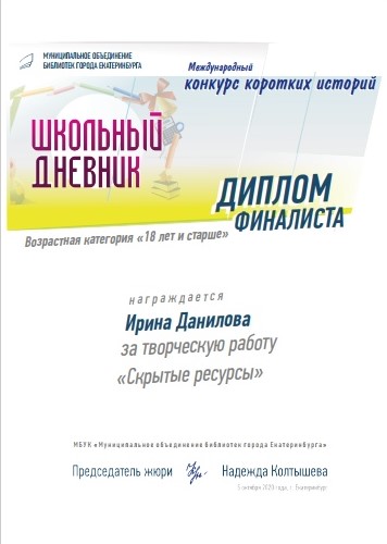 Спасибо Оргкомитету Международного конкурса «Школьный дневник», Муниципальному объединению библиотек города Екатеринбурга, журналу «Урал», региональному представительству издательства «ЭКСМО Екатеринбург» и Надежде Колтышевой за влючение в сборник и список финалистов!Сборник можно скачать и почитать бесплатно — по ссылке.