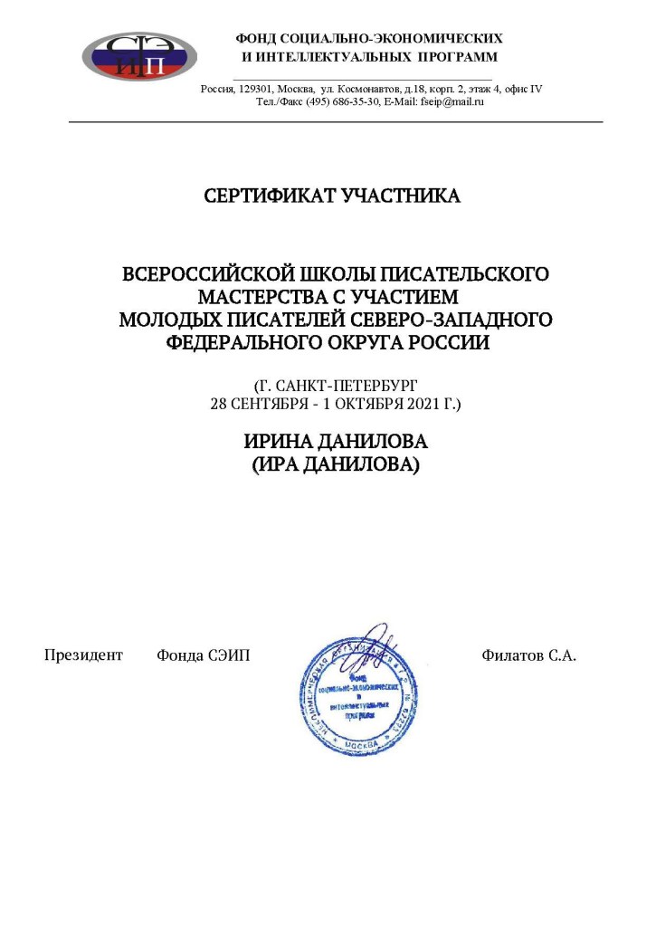 Спасибо Фонду СЭИП и мастерам Сергею Александровичу Надееву, Галине Даниелевне Климовой, Анне Игоревне Маркиной , Марии Борисовне Ануфриевой и журналу «Дружба народов» за счастье стать одним из семинаристов Всероссийской Школы писательского мастерства СЗФО-2021.