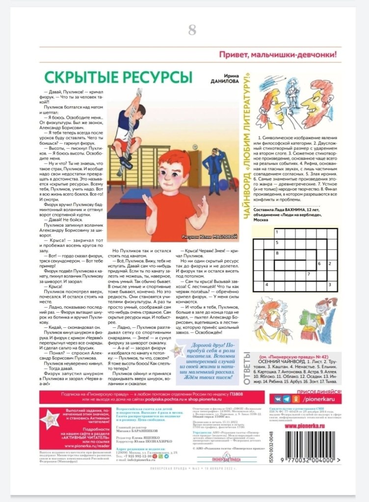 Новая публикация в старейшей газете «Пионерская правда»: №43, 2022 — фельетон «Скрытые ресурсы». Фельетон участвовал в читках литературного фестиваля КоРа в 2021 году. До 1 октября фестиваль принимает заявки на участие в новом сезоне.