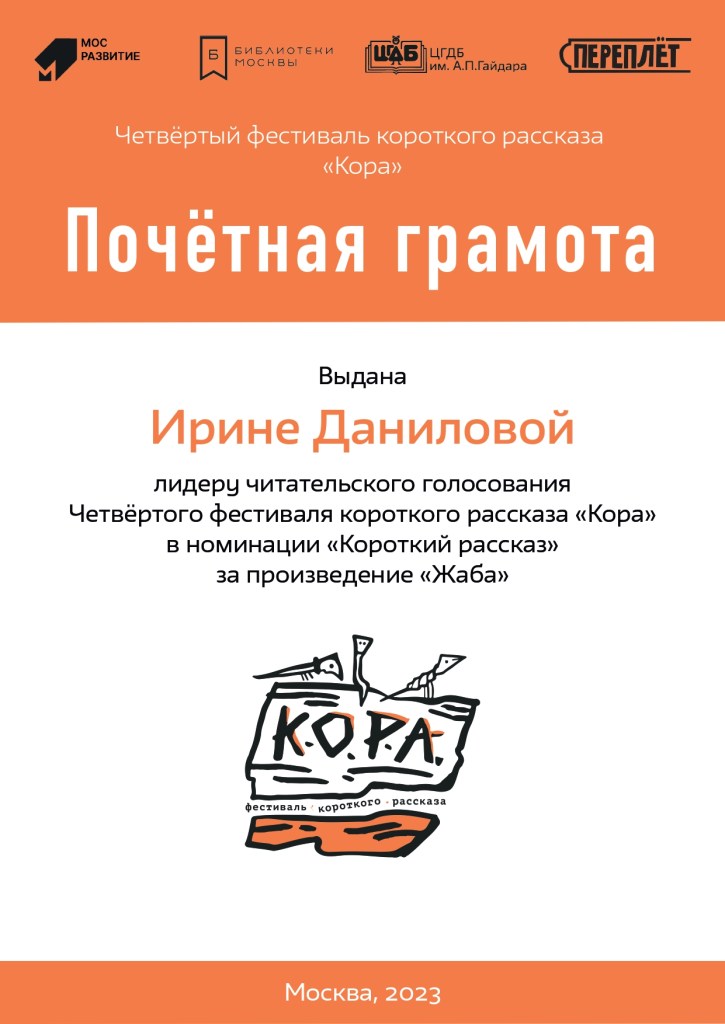 Мои рассказы «Жаба» и «Переходный возраст» стали финалистами Международного фестиваля короткого детского рассказа «КоРа-2023». Их можно прочитать на сайте фестиваля. Рассказ «Жаба» получил первый приз читательского голосования. Спасибо каждому, кто выбрал этот текст!