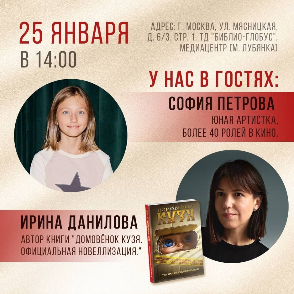 Издательство Детские книги АСТ Дети приглашает! 25 января в 14:00 Ирина Данилова, автор новеллизации нового фильма «Домовенок Кузя», и юная София Петрова, актриса, исполнительница роли Наташи, ждут вас в гости! Вы познакомитесь с теми, кто создал эту красивую и яркую сказку, узнаете секреты киносъемок и написания книг, вдоль и поперек обсудите нашу родную русскую нечисть, сможете принять участие в веселом тематическом квие для детей.